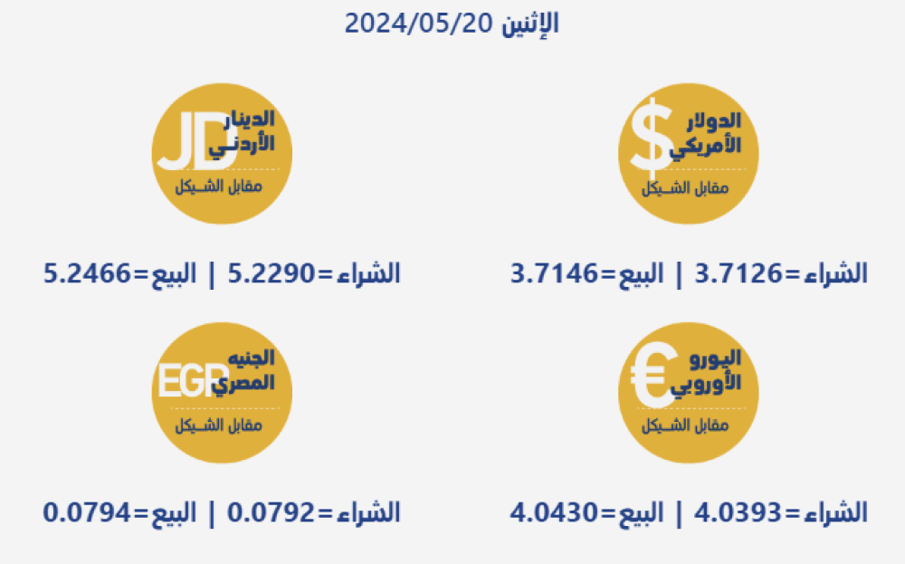 أسعار العملات الرئيسية المتداولة في السوق المحلية مقابل الشيقل