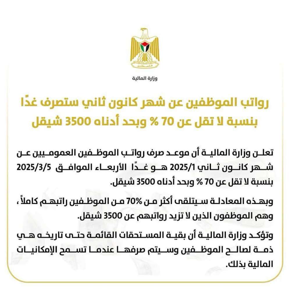 المالية: رواتب الموظفين غدا بنسبة لا تقل عن 70%